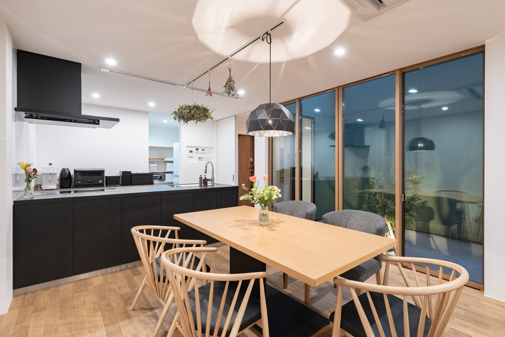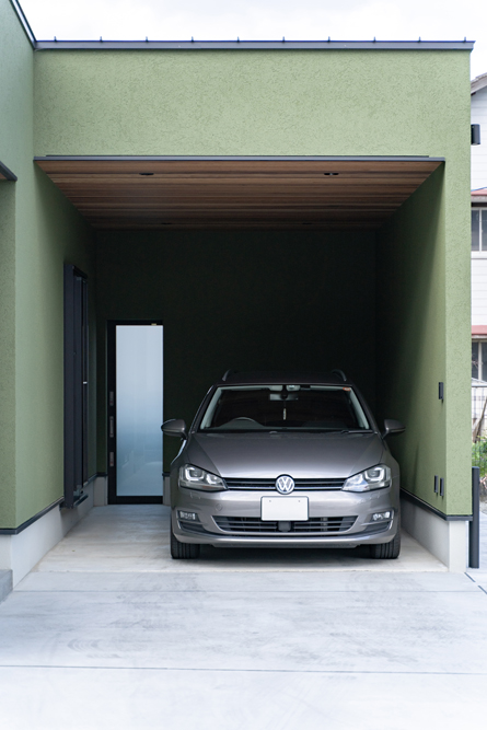 17.【外装のグリーンと木目。森林へととけこむ】インナーガレージのある家
